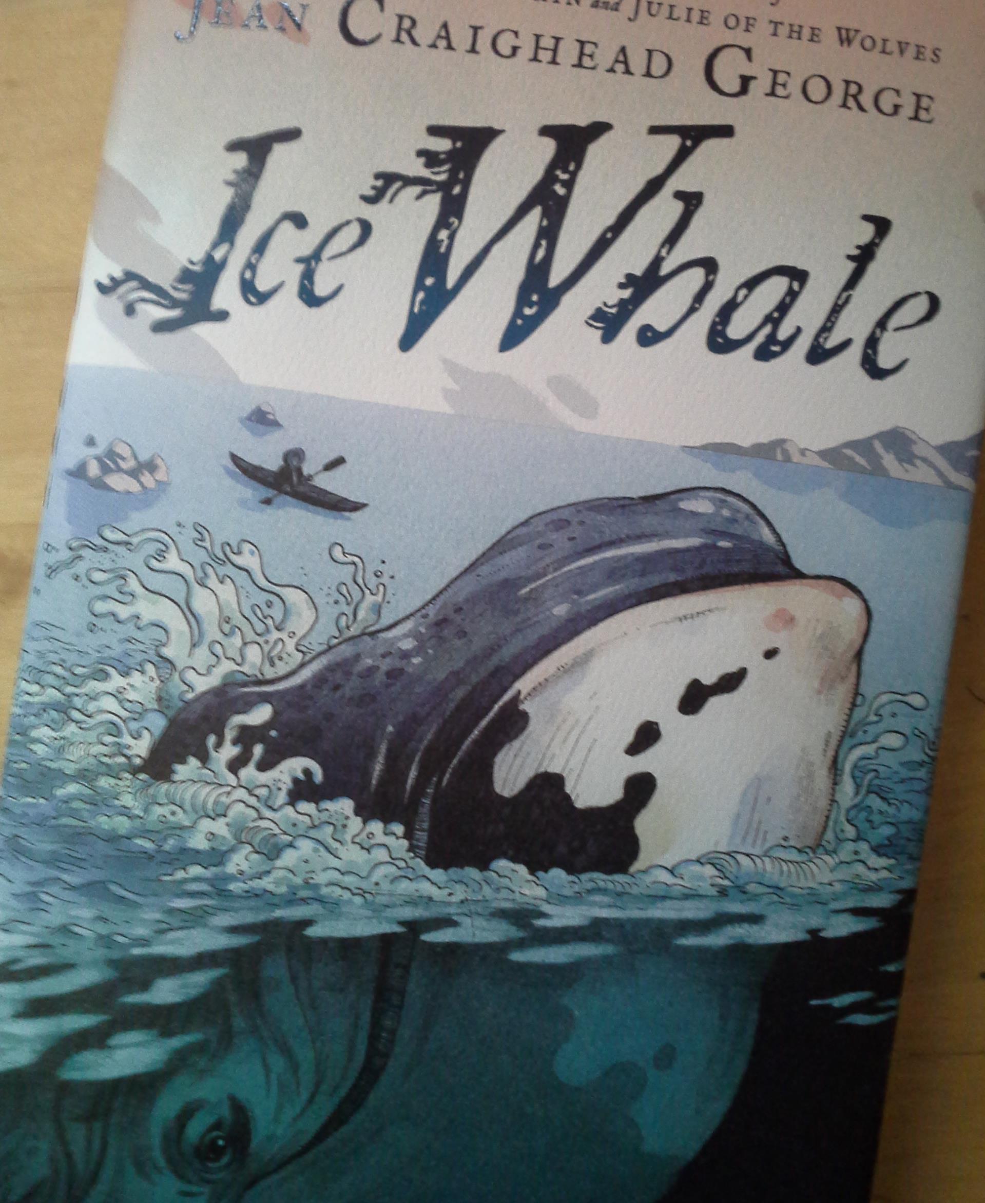 I’ve been reading Ice Whale by Jean Craighead George aloud to Owen since Christmas. It’s hard to tell if he likes it. Owen responds to verbal communications more when there are familiar repeated texts. It seems as though he doesn’t “hear” unfamiliar voices from unfamiliar books, movies, or people. So I plan to read the book to him a couple of times and see if he grabs on. He may be enjoying it very much. Even though he hides his head under the blanket or turns his back, he does have a listening energy about him. I was attracted to the book by its cover illustration, a breaching bowhead. Whales seem connected to Owen for several reasons. First because of Chaos, his long-ago inflatable orca friend (if you haven’t met Chaos, see About section), but also because both Owen and whales are mysterious creatures, swimming through life communicating in unusual ways.